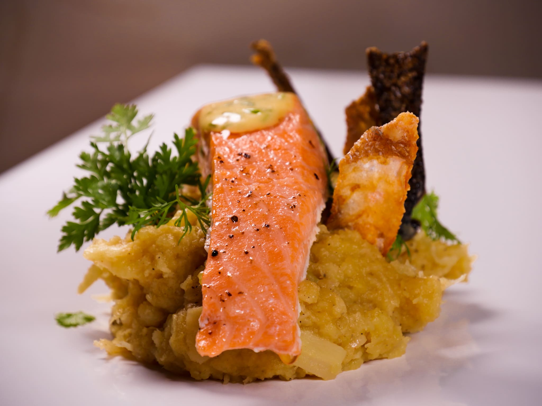 Für uns besteht ein leckeres Pastinakenpüree aus saftigen und süßen Pastinaken, die zu einem cremigen Püree gemixt werden. Dieses Püree hat eine perfekte Konsistenz, die weich auf der Zunge zergeht. Der Geschmack ist erdig und nussig, bietet aber auch eine angenehme Süße Note mit einer subtilen Würze. In unserer Variante fügen wir noch etwas Tahin (Sesampaste) hinzu, wodurch das Püree einen extra Kick Mineralien erhält. Gerade zu Tranfischen wie dem Lachs ist diese Variante ein gelungener Gegenspieler.